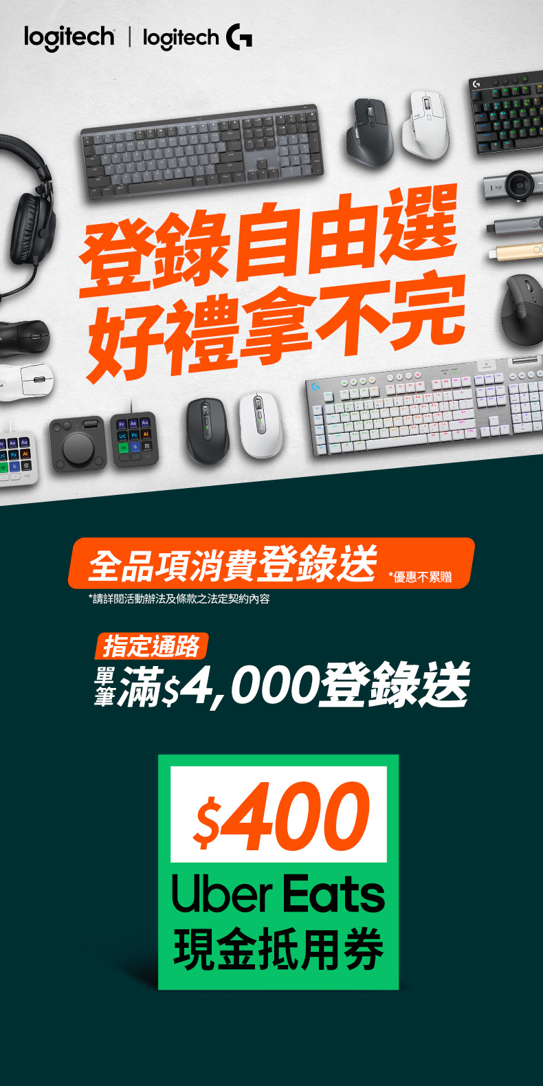 2026/4/1-2026/5/31於指定通路購買Logitech 品項,以「羅技 logi 網路旗艦店」會員身份,單筆發票羅技產品金額滿$4,000 完成登錄並審核成功,即獲$NT400元UberEats。